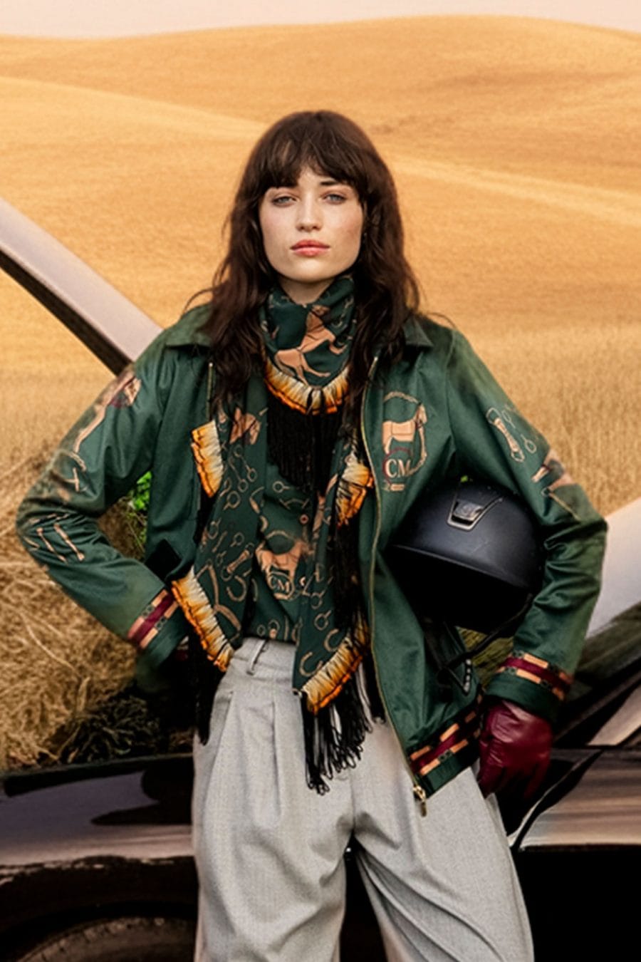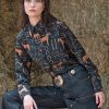 All time classic line shirt in viscose weave with camel horses pattern on a green background.